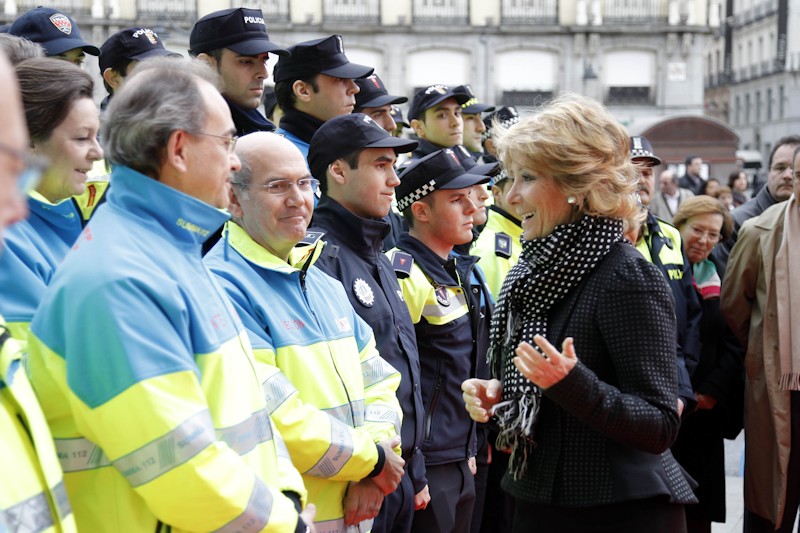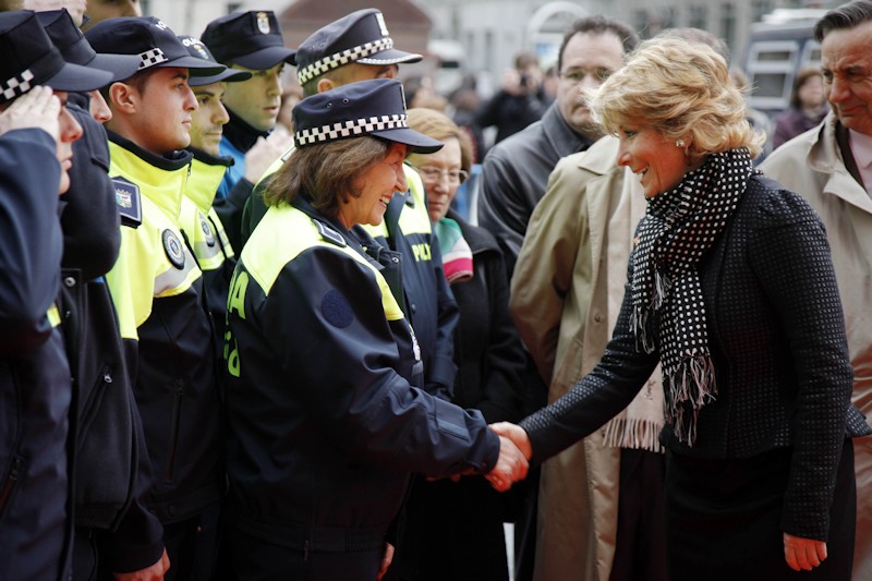 La presidenta de la Comunidad de Madrid, Esperanza Aguirre, saluda a policías locales