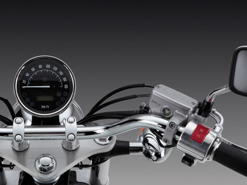 Sucinto salpicadero de la nueva VT750S. Sólo el velocímetro y los testigos principales. Junto al puño derecho la bomba de freno del único disco, el delantero.