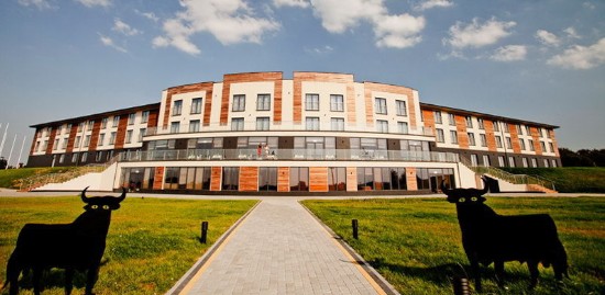 Como no podía ser de otro forma, la entrada del hotel de la selección española está presidida por dos toros.
