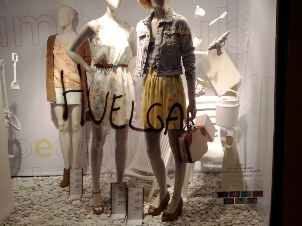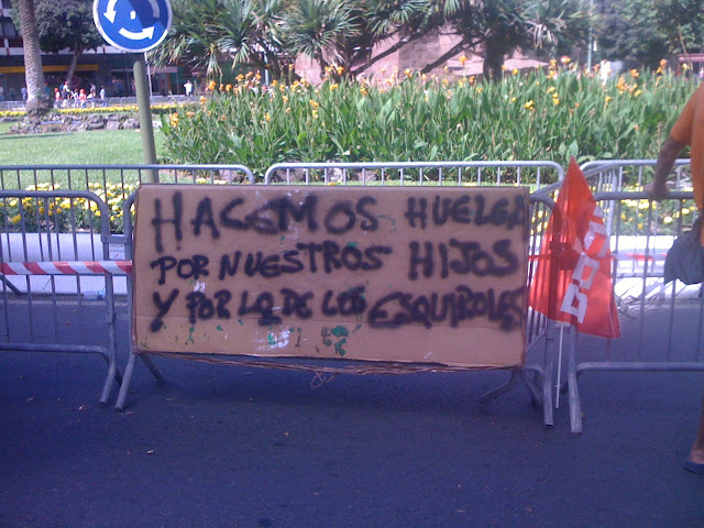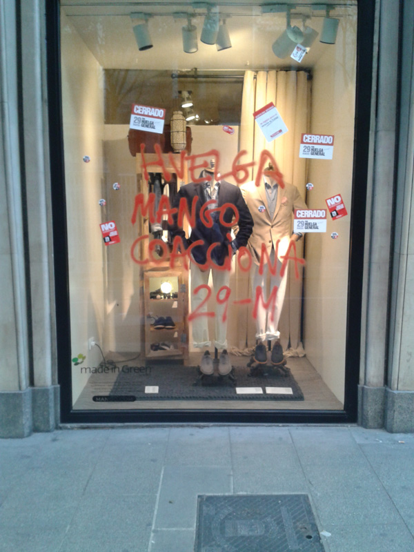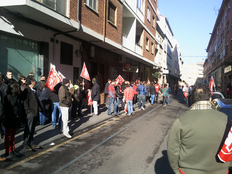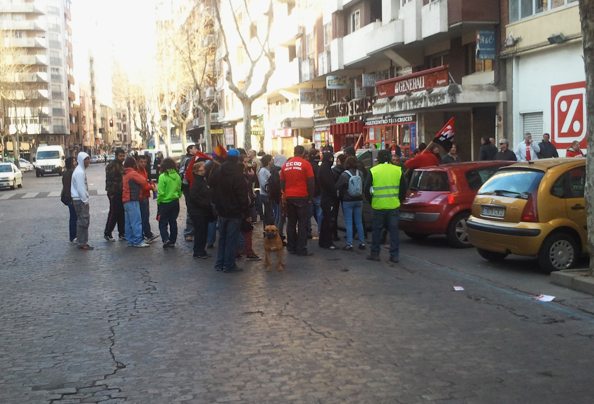 Aquí la foto de un piquete de CC.OO. y CNT en Zamora. En él se puede ver a varios jóvenes encapuchados que portan tanto banderas republicanas como un perro. La intervención de la Policía evitó males mayores en el comercio "Día" al que acudieron a "informar".