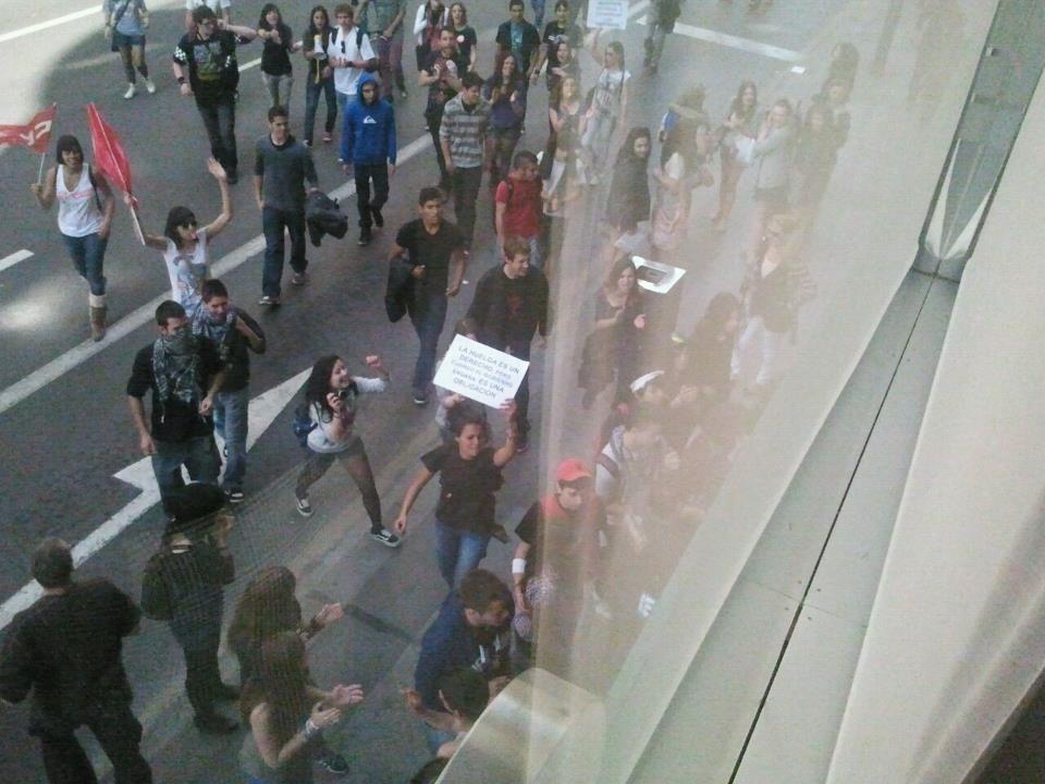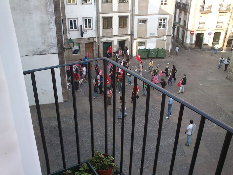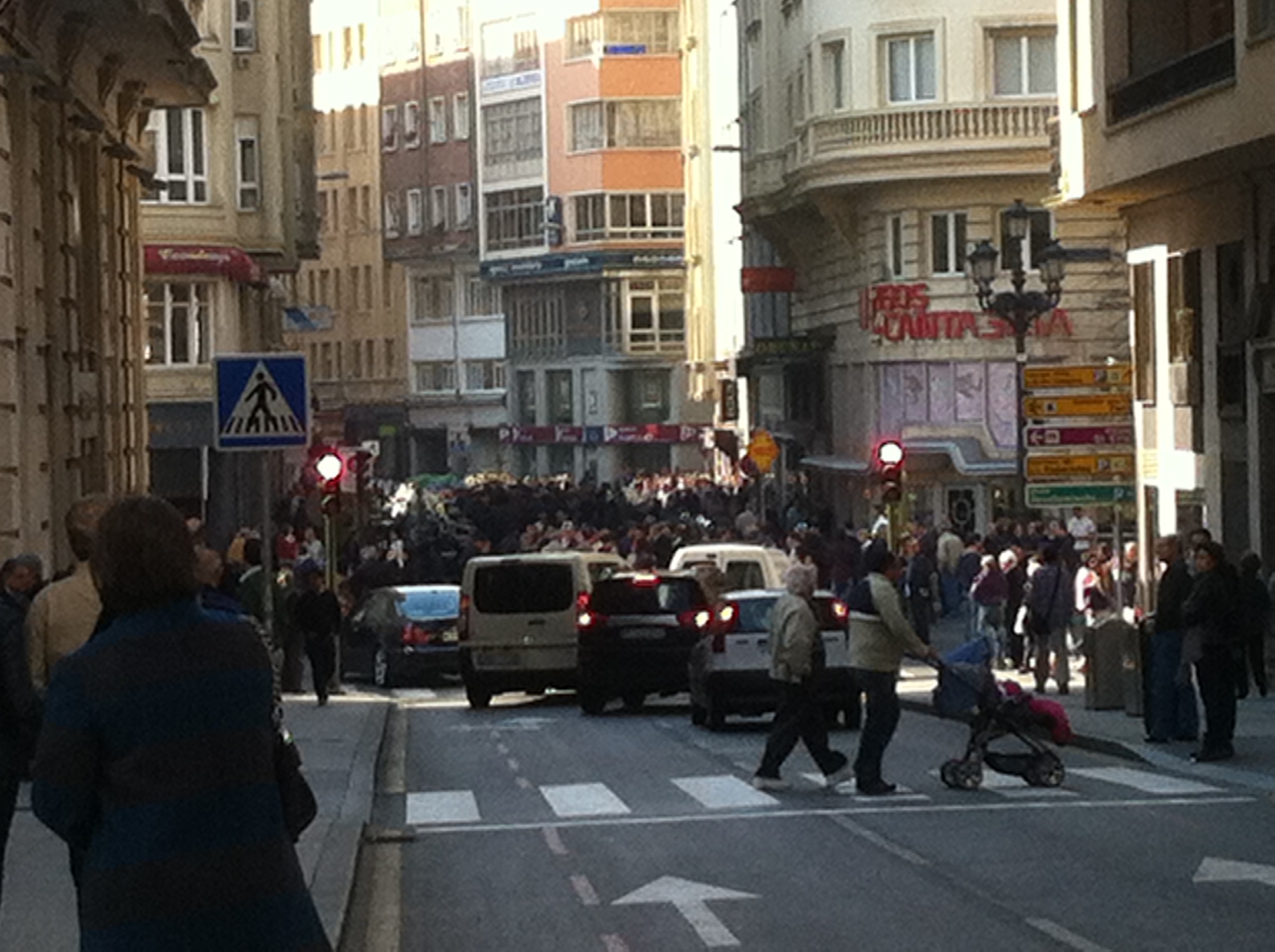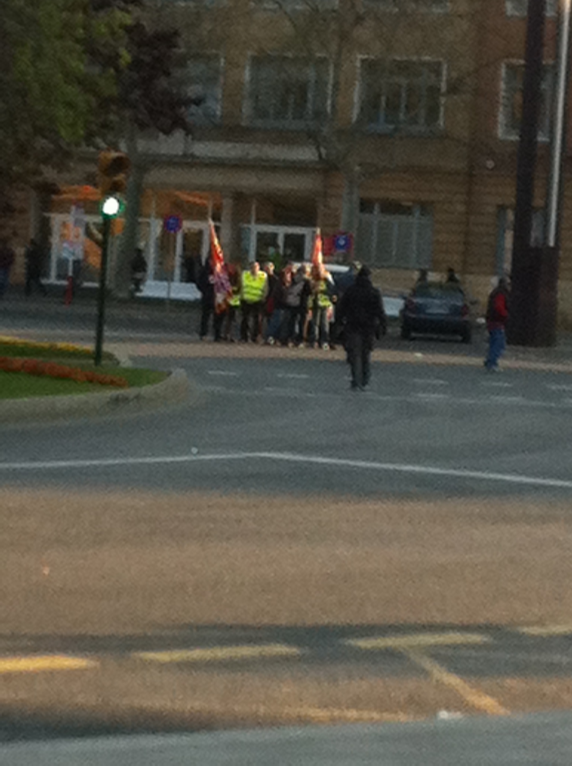 Aquí la foto de un piquete de CC.OO. y CNT en Zamora. En él se puede ver a varios jóvenes encapuchados que portan tanto banderas republicanas como un perro. La intervención de la Policía evitó males mayores en el comercio "Día" al que acudieron a "informar".