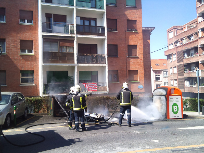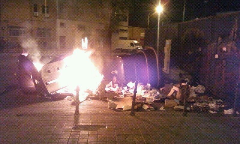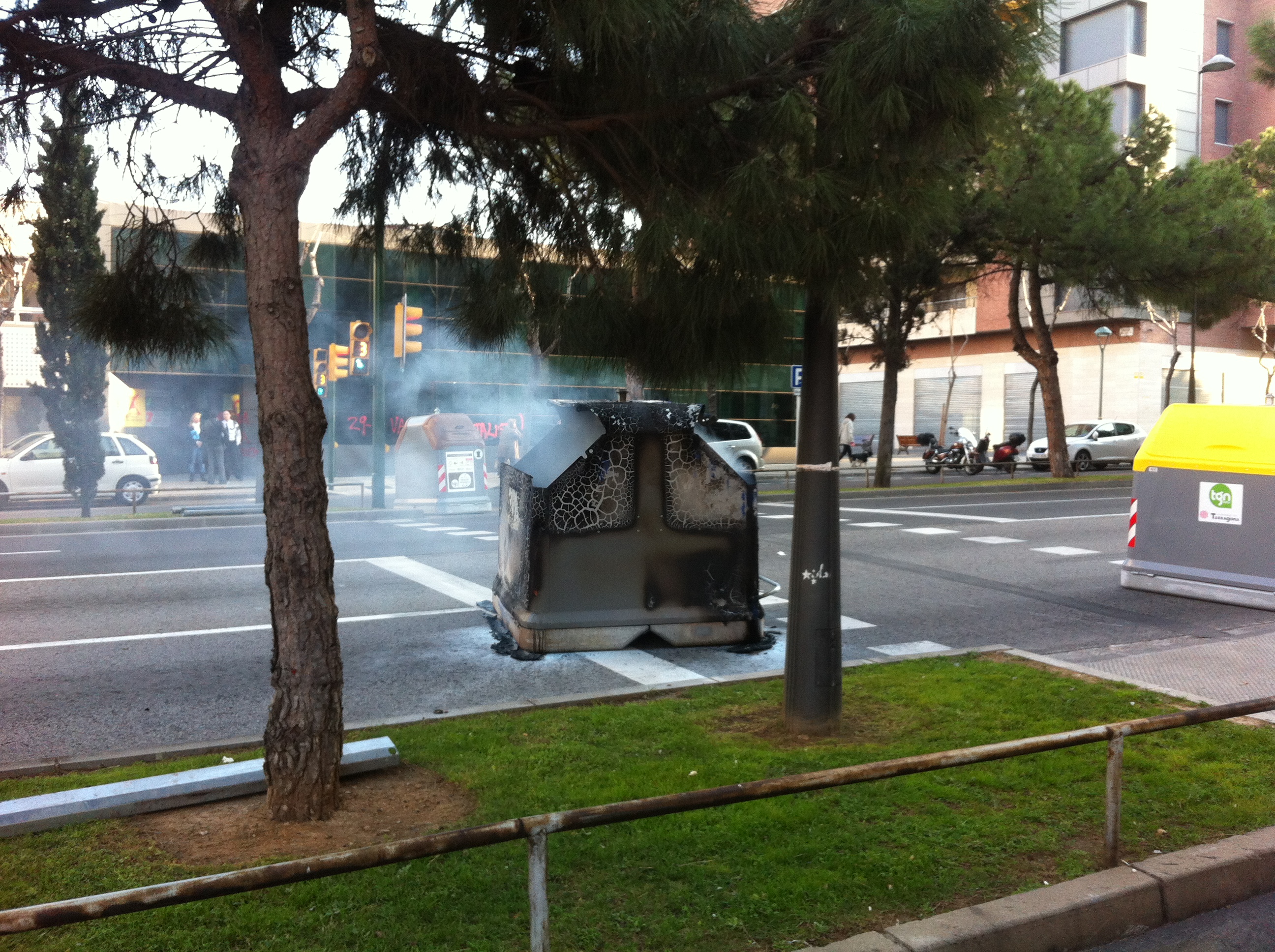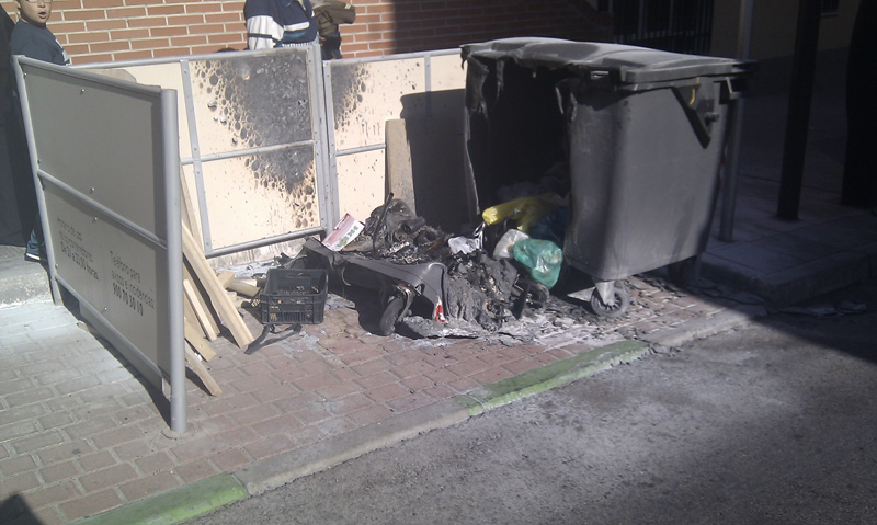 Contenedor quemado la pasada noche en la calle Melilla de Alcobendas, barrio obrero y bien alejado de Poligonos industriales.
