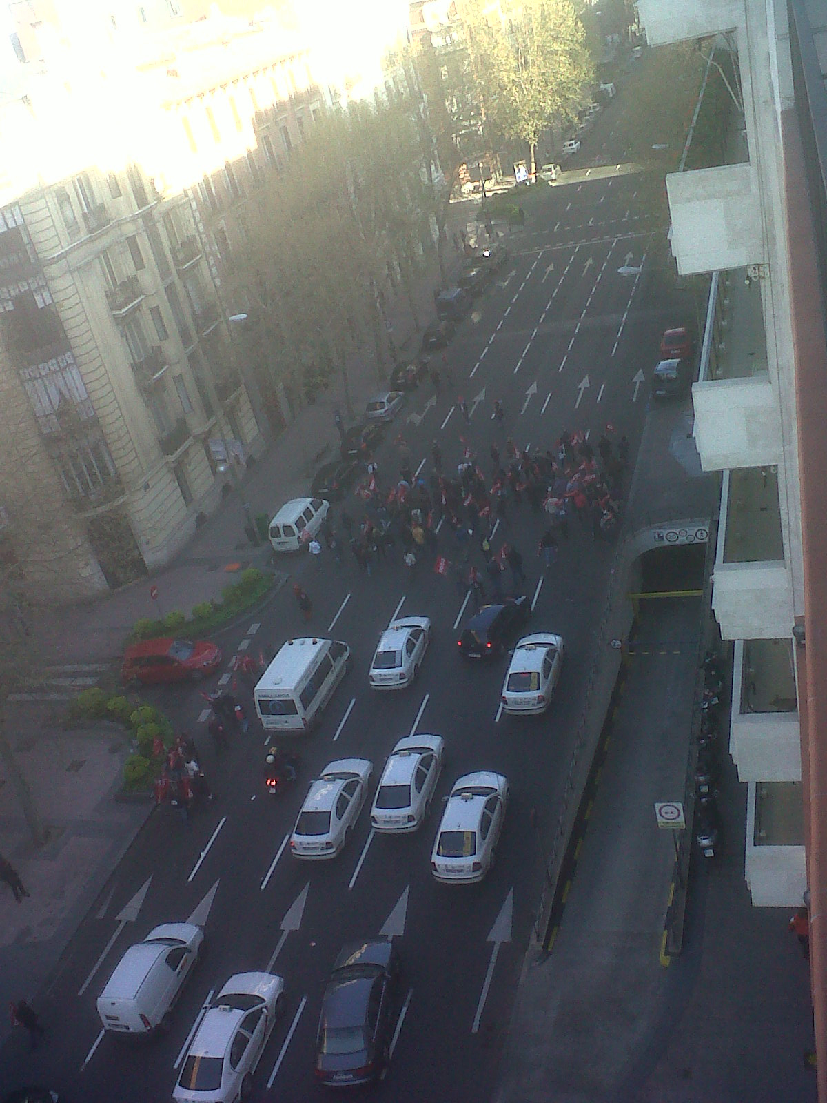 Corte que han realizado sindicalistas de CCOO al inicio de la calle Velázquez en Madrid, paralizando el tráfico a su paso.