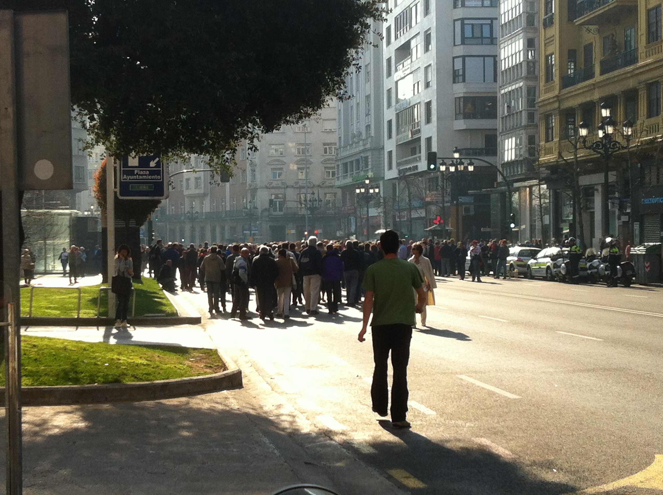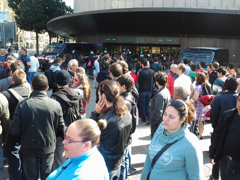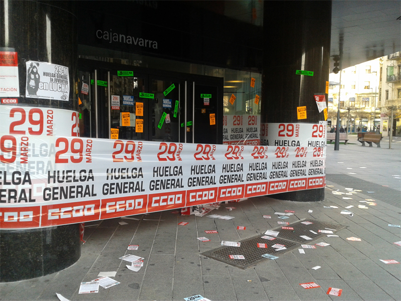La foto es la entrada de Caja Navarra, los trabajadores ha tenido q entrar por los garages, un fuerte dispositivo de la Policia Nacional salvaguardando el edificio.