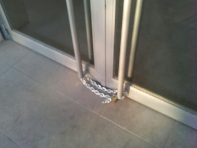 Restos de una noche movidita en el SuperCor de Ferrol que ha tenido que dejar cerrada esta puerta (11,20 hs.) y abrir otra con seguridad privada.