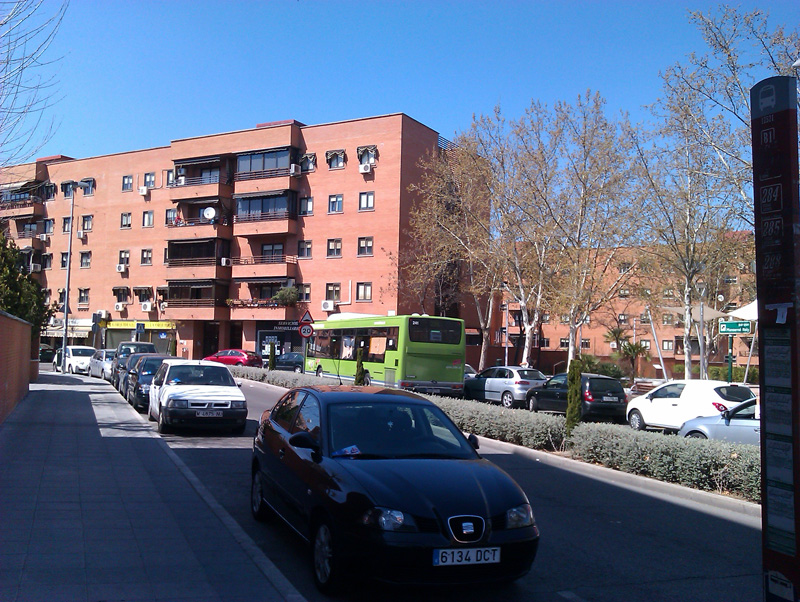 Autobús de la linea 288 en San Fernando de Henares, con el cartel de servicios mínimos, con dos lunas laterales rotas.