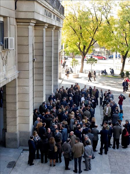 Jueces y magistrados a las puertas de los juzgados de Sevilla durante el acto de protesta que se ha llevando a cabo este miércoles en demanda de mejoras estructurales en la Administración de Justicia. (EFE/EDUARDO ABAD)