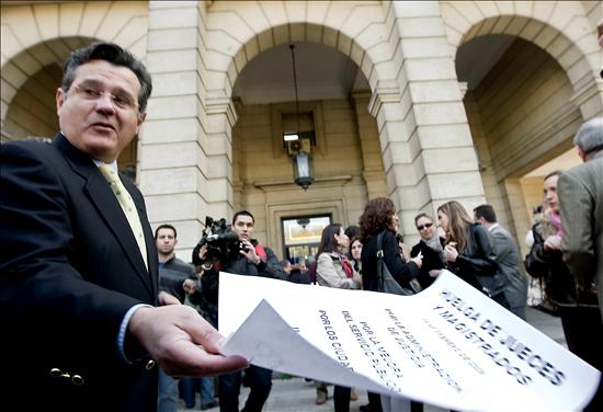 El magistrado Juan Márquez, presidente de la Sección Quinta de la Audiencia de Sevilla y familiar del juez Rafael Tirado Márquez, sancionado por el llamado "caso Mari Luz", con una convocatoria de la jornada de huelga de los jueces y magistrados, durante la concentracion que han realizado hoy frente a la puerta de los juzgados sevillanos. (EFE/EDUARDO ABAD)