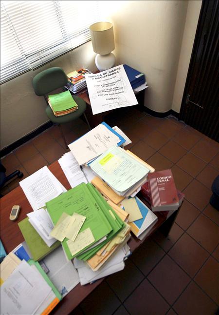 Un cartel (al fondo) en el despacho de la Titular del Juzgado nº10 de lo Social de Barcelona anunciando la huelga de jueces que las asociaciones Francisco de Vitoria (AJFV) y Foro Judicial Independiente (FJI) han organizado en toda España en demanda de mejoras estructurales en la Administración de Justicia. (EFE/Alberto Estévez)