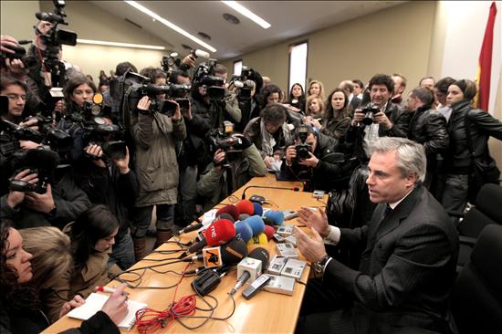 El decano de los jueces de Madrid, José Luis González Armengol (d), atiende a los medios de comunicación en los juzgados madrileños de Plaza de Castilla, donde se ha celebrado este miércoles una asamblea de jueces y magistrados, durante la jornada de huelga convocada en todo el país. (EFE/Emilio Naranjo)