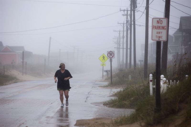 Margene Jezo de Kitty Hawk realiza una carrera de 6 millas mientras el huracán Irene azota las islas Outer Banks en Kitty Hawk, Carolina del Norte.