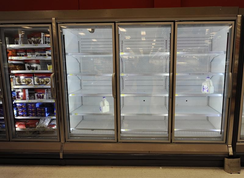 Vista de dos empaques de leche en un estante de un supermercado en Nueva York (EEUU). Los residentes de las zonas con mayor peligro han evacuado ante el riesgo de sufrir inundaciones. Efe/Andrew Gombert