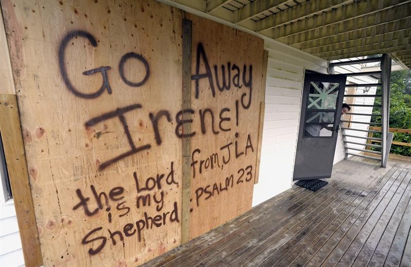 Pintada que dice: "Vete lejos Irene, el señor es mi pastor, Salmos 23" previo a la llegada del huracán 'Irene' hoy, sábado 27 de agosto de 2011, en Nueva York.