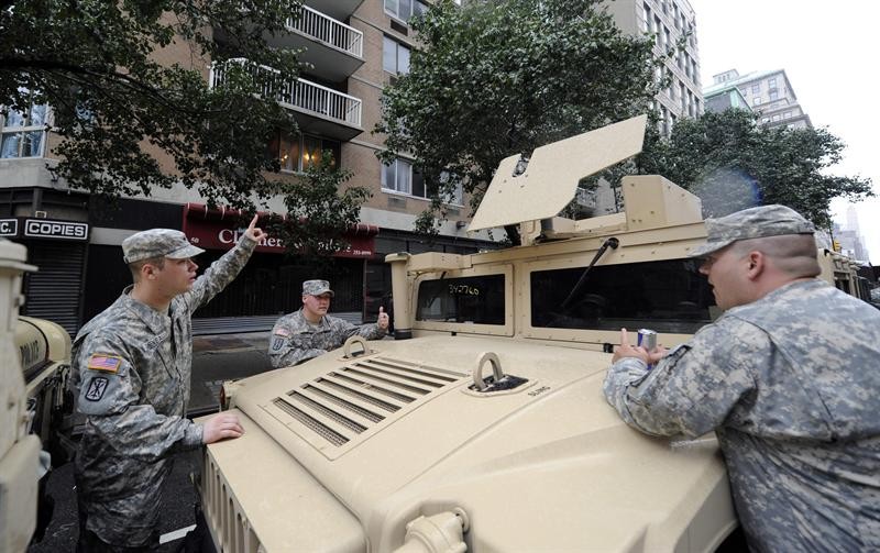 Oficiales de la Guardia nacional corren hacia el Regimiento 69 en donde permanecen durante el paso del huracán Irene en Nueva York. Efe/Andrew Gombert