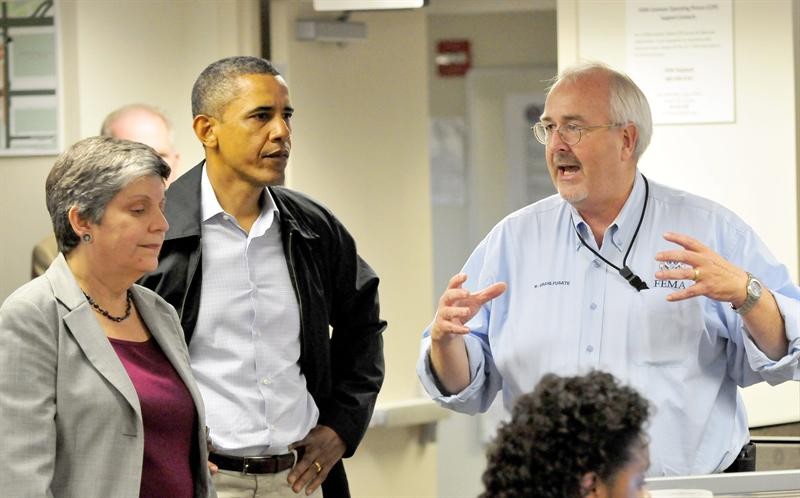 El presidente de EE.UU., Barack Obama y la secretaria de Seguridad Nacional, Janet Napolitano (i), escuchan al director de la Agencia Federal para la Gestión de Emergencias (FEMA), Craig Fugate (d), a su llegada a la sede de la FEMA en Washington DC.