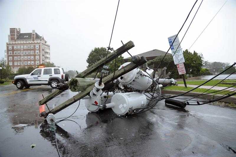 Unos policías aseguran el perímetro en una calle en la que se cayeron varios postes de la luz por efecto del huracán 'Irene' en Montauk (Long Island, Nueva York).
