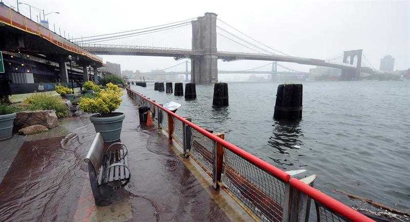 Las aguas anegan el paseo de South Street Seaport en Nueva York.