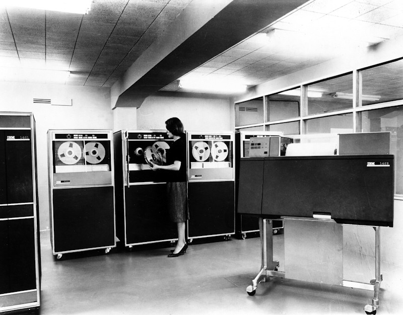 Uno de los primeros clientes españoles de IBM fue Galerías Preciados. En la imagen, de 1962, la instalación 1401 en las oficinas de los grandes almacenes.