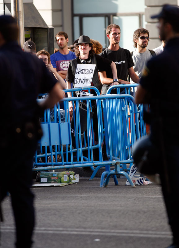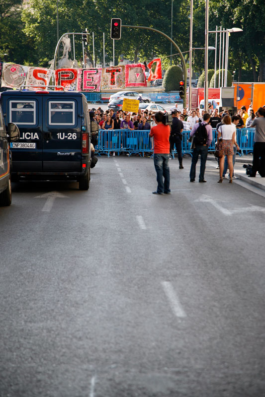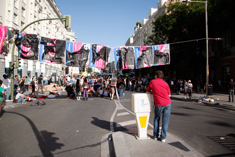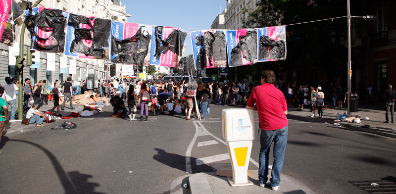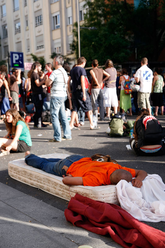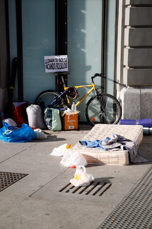Junto a los cartones los colchones son parte inevitable de la impedimenta indignada. Tras una noche de acampada este era el aspecto de una de las puertas del Palace.