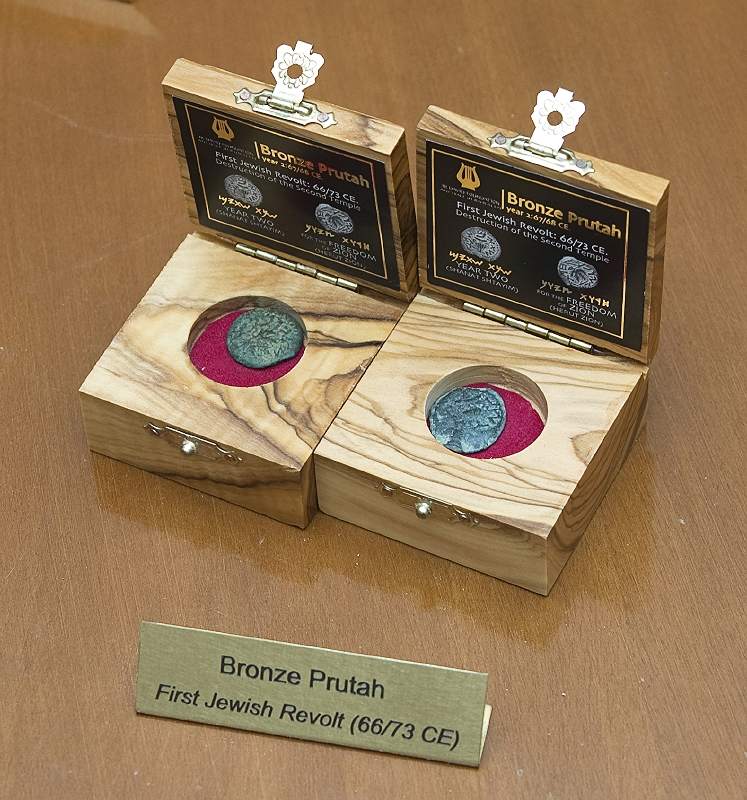 Monedas encontradas en Ir David. En una de ellas se puede la inscripción Para la libertad de Sión.