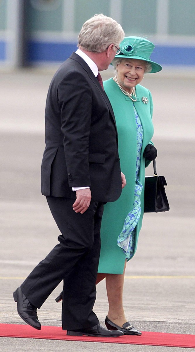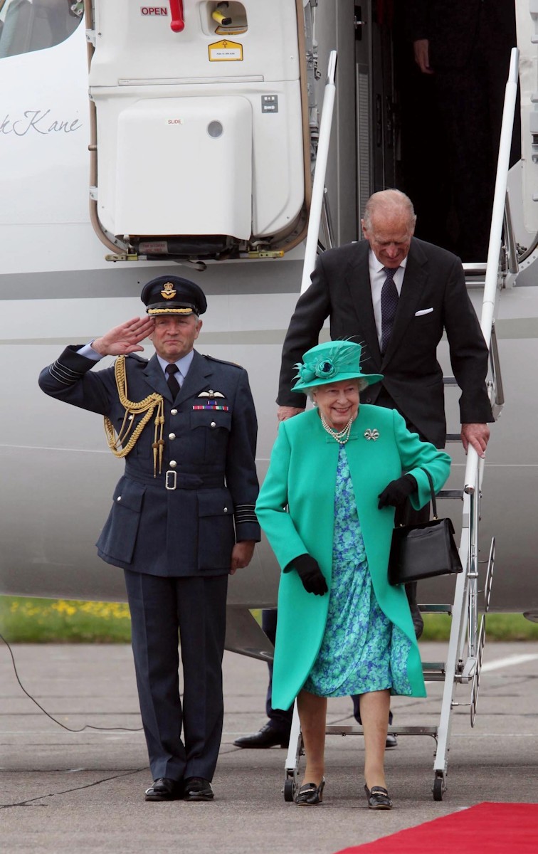 La reina británica, sonriente nada más aterrizar en el aeródromo Casement, cerca de Dublín.