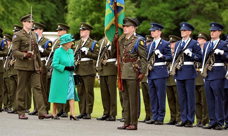 La reina pasa revista a la guardia de honor a su llegada a Aras an Uachtarain, la residencia oficial de la presidenta irlandesa.