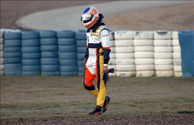 El piloto brasileño de fórmula 1 Nelson Piquet Jr.(Renault), tras salirse su monoplaza de la pista. (EFE)