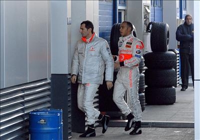 El piloto británico Lewis Hamilton, junto a su compañero Pedro Martínez de la Rosa, en los boxes del equipo McLaren-Mercedes). (EFE)