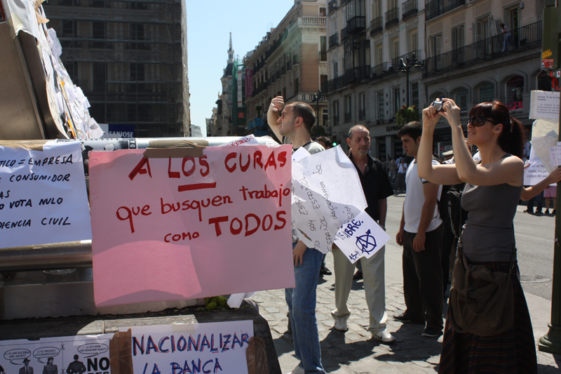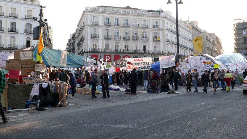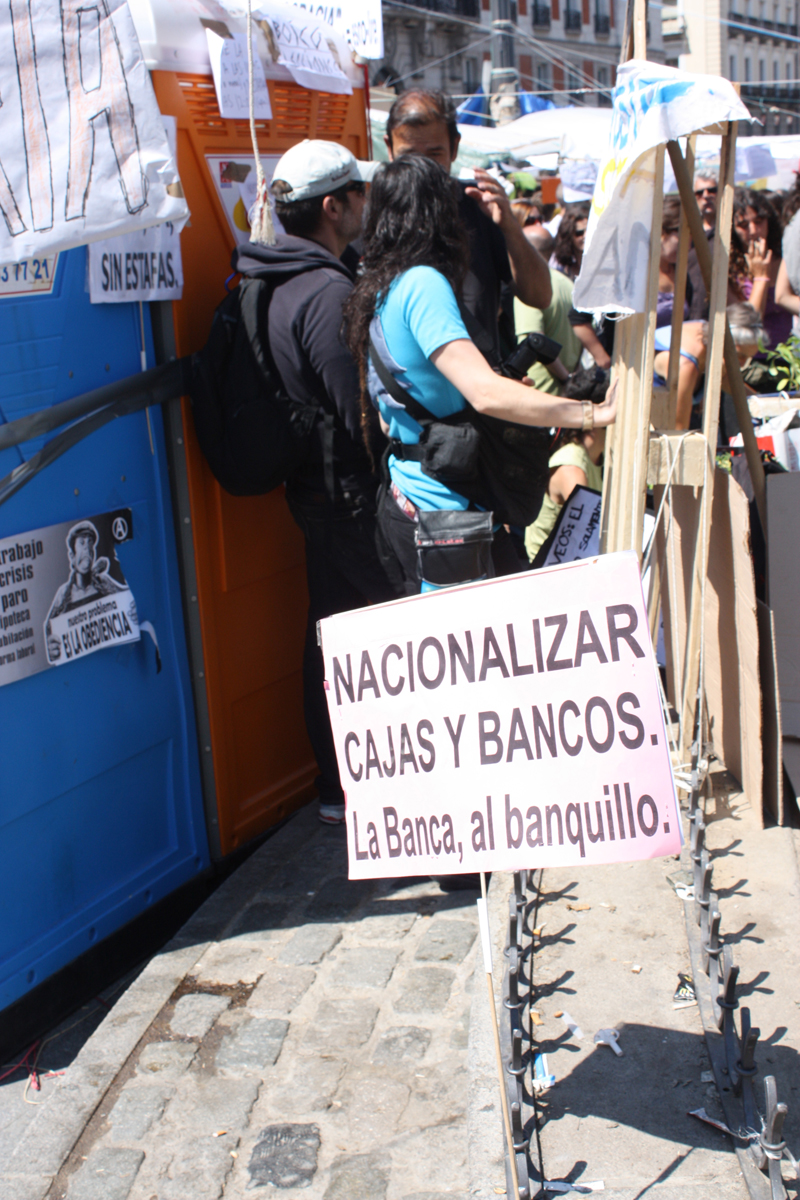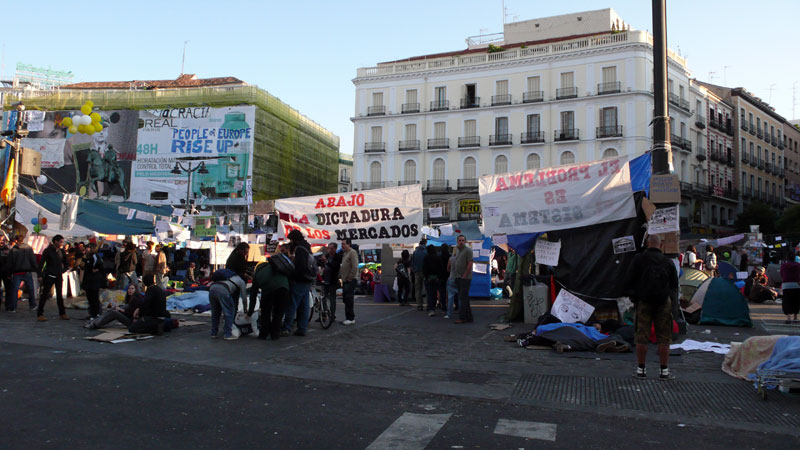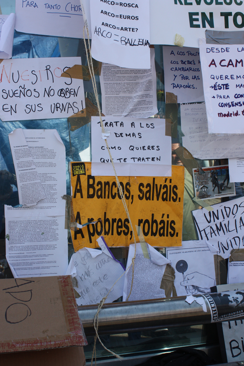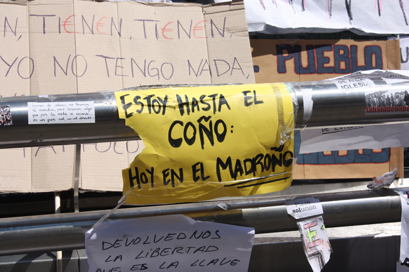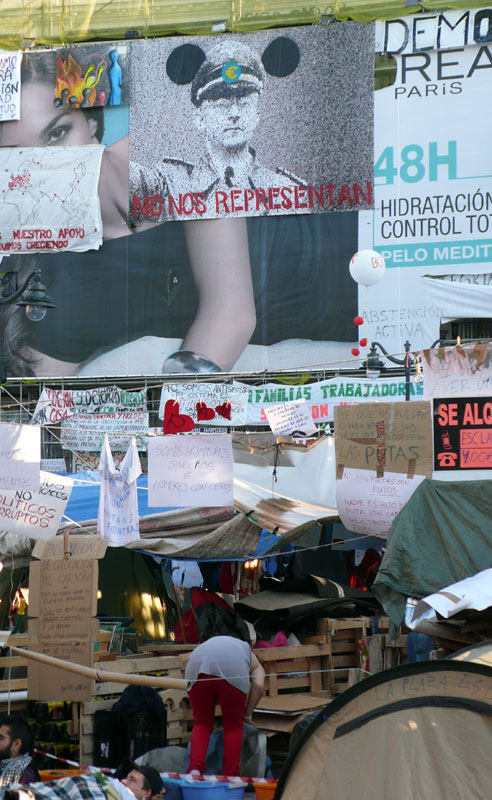 Las pancartas, como la de "Abajo los mercados" ya llenan por completo la Puerta del Sol.