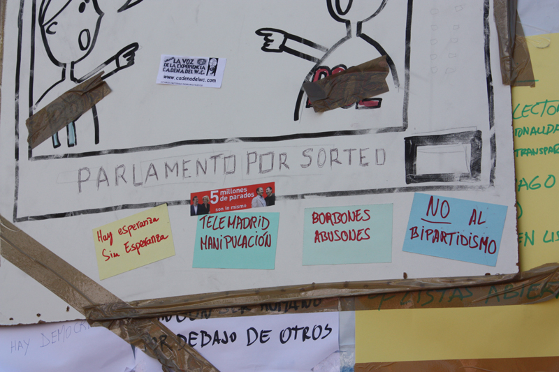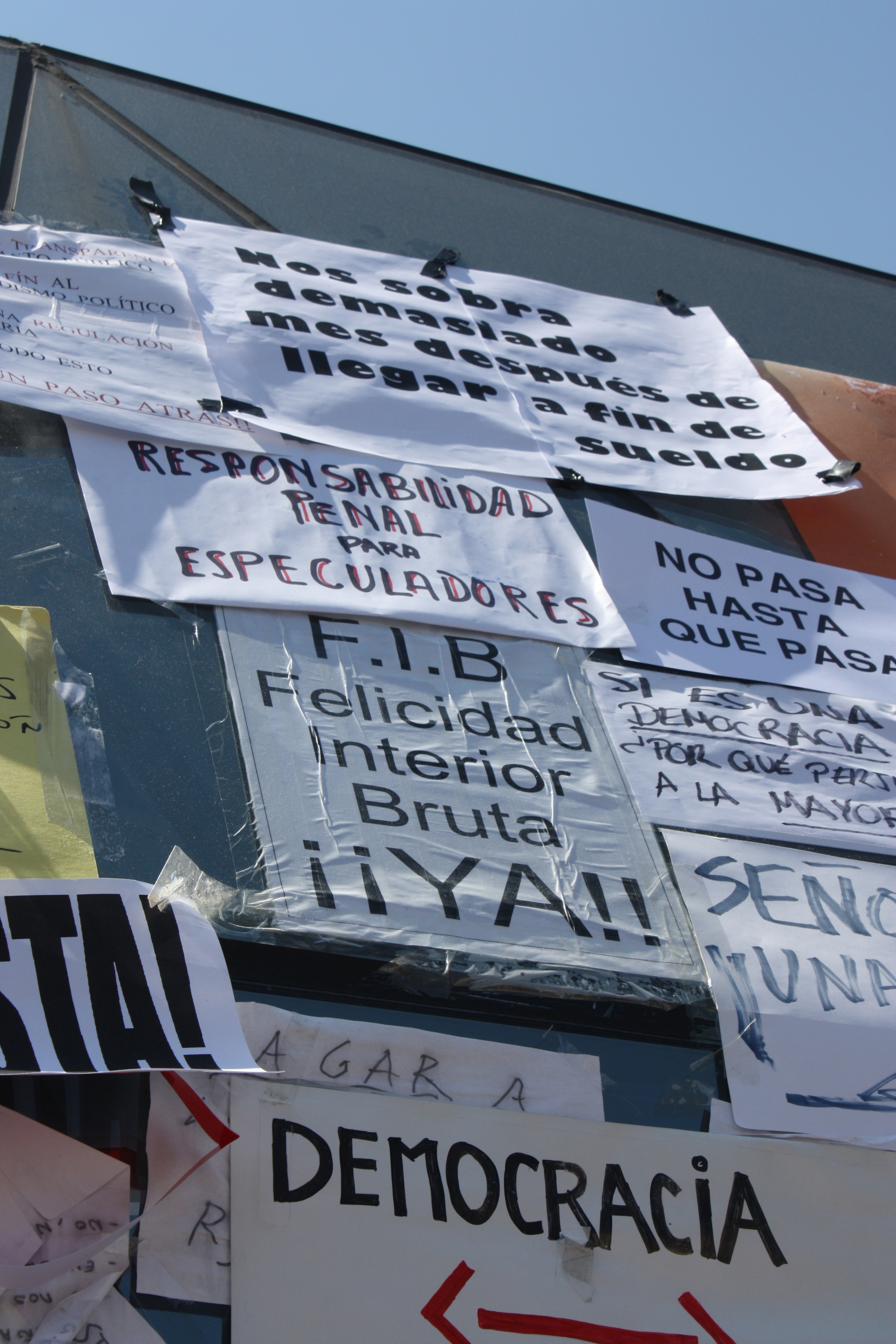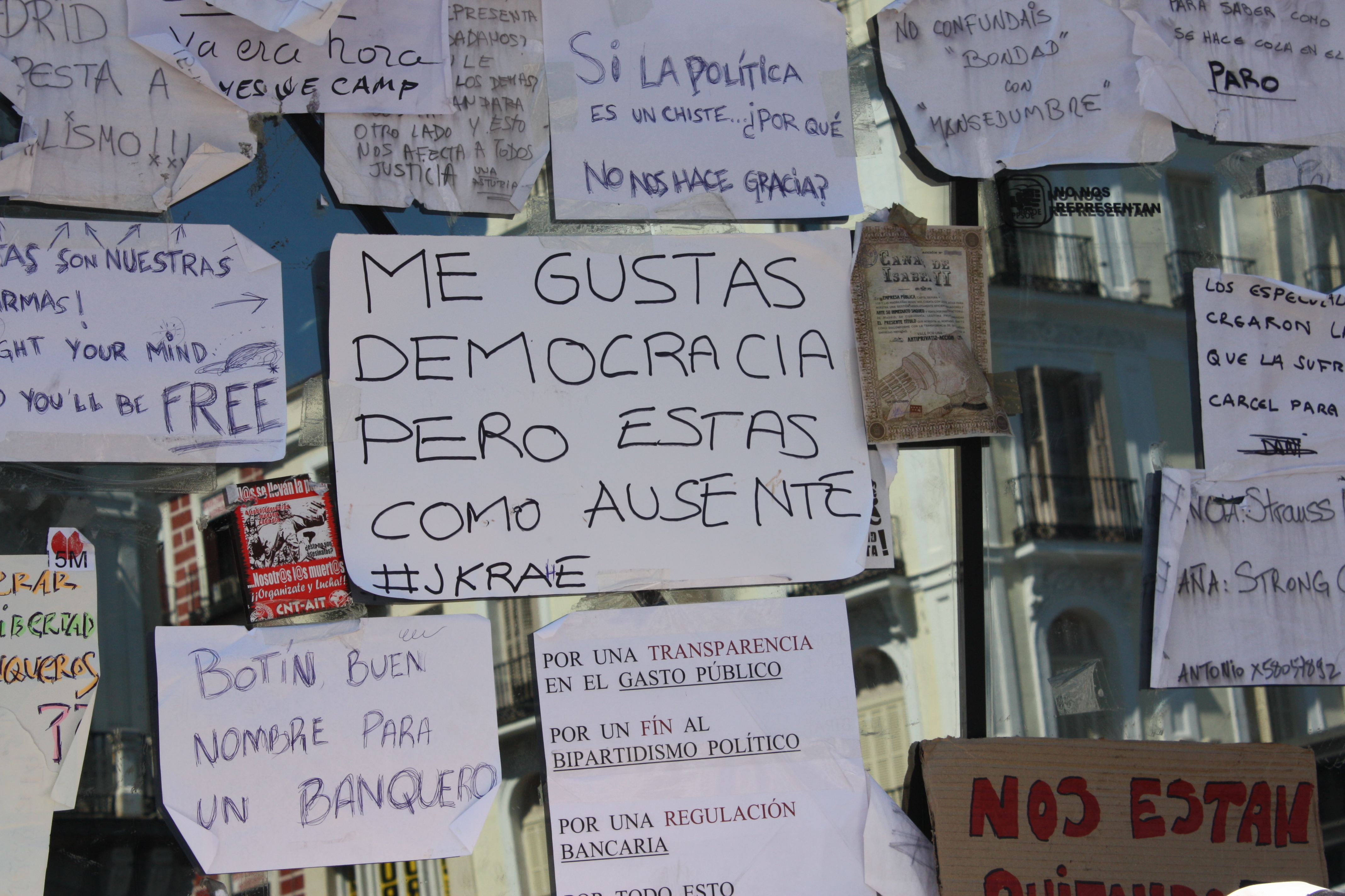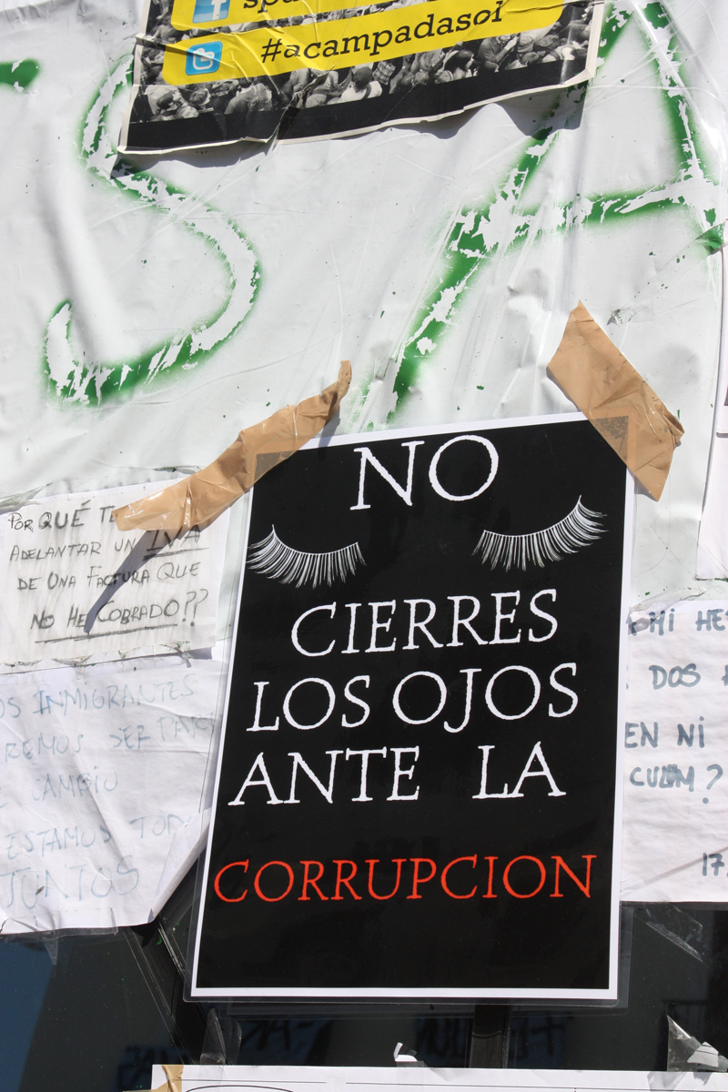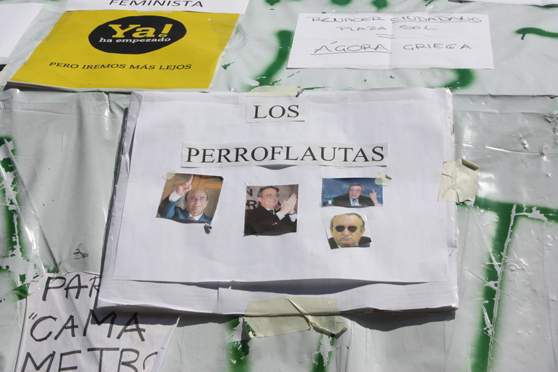 Las pancartas, como la de "Abajo los mercados" ya llenan por completo la Puerta del Sol.