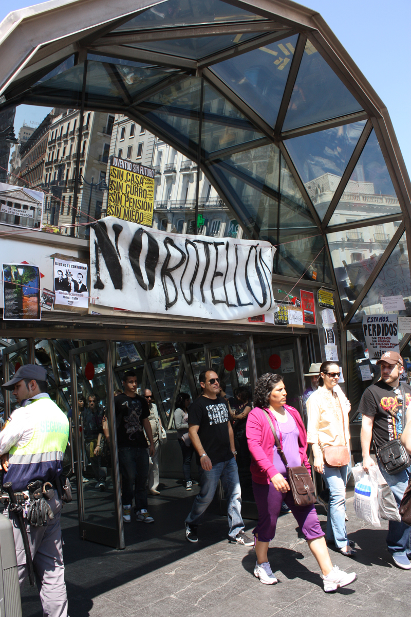 Salida del metro de Sol, en la que se insiste en beber en la acampada.