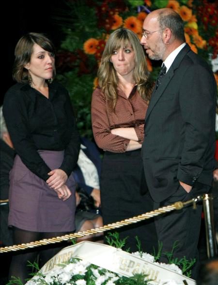 Los hijos del actor José Luis López Vázquez junto a la capilla ardiente de su padre, en el Teatro María Guerrero, sede del Centro Dramático Nacional, y lugar en el que López Vázquez debutó en 1940.