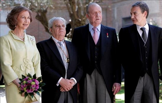 El Rey, Zapatero y Sonsoles ríen mientras posan junto a Marsé. (EFE)