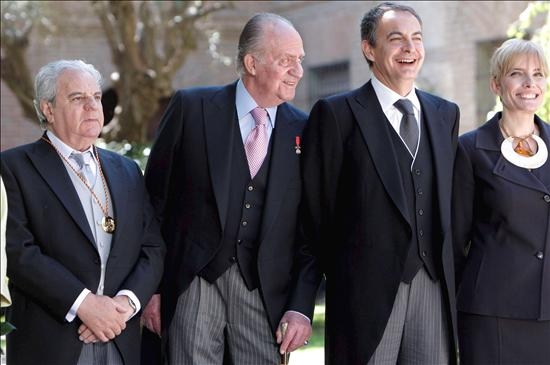 Zapatero escucha atentamente al Rey durante el acto en la Universidad de Alcalá de Henares. (EFE)