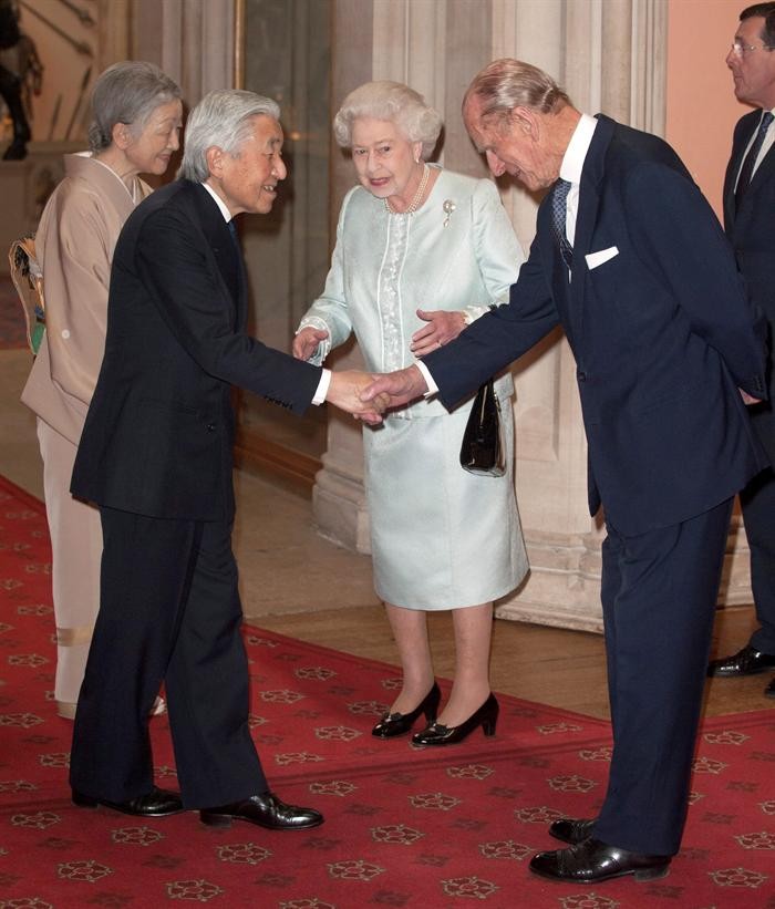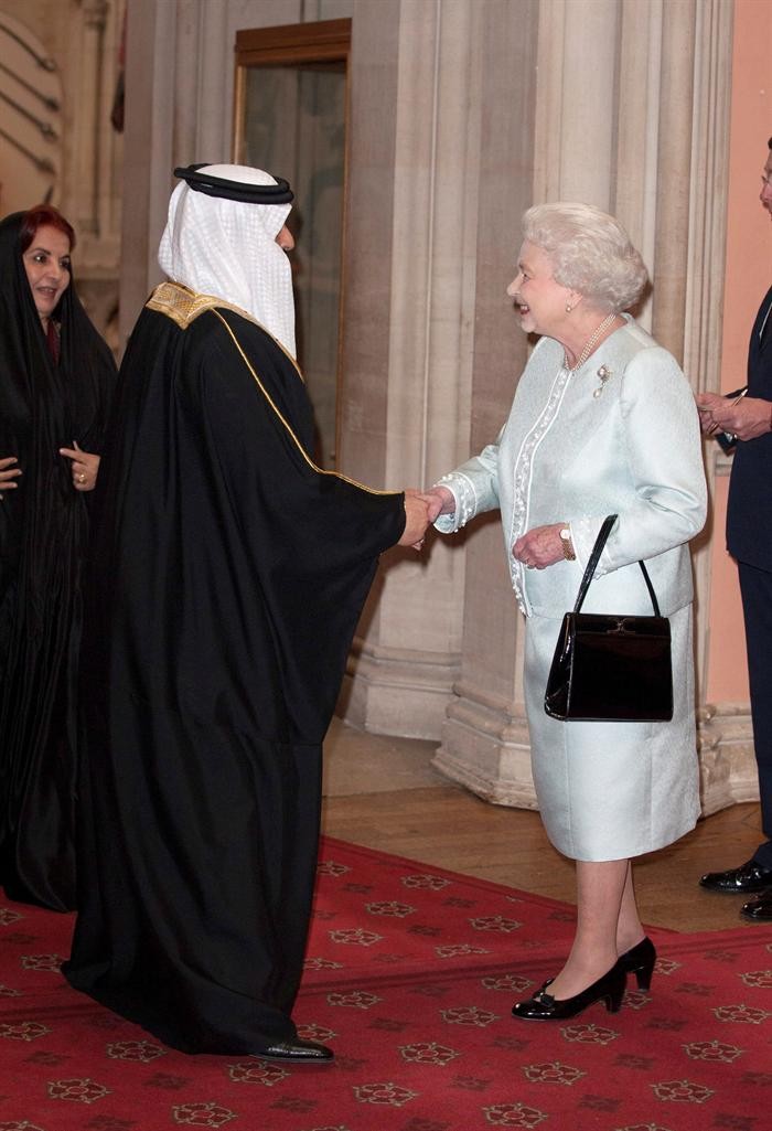 La reina Isabel II de Inglaterra recibe al rey de Bahrein, Hamad bin Isa Al Khalifa, (i), a su llegada a la celebración de su Jubileo de Diamantes.