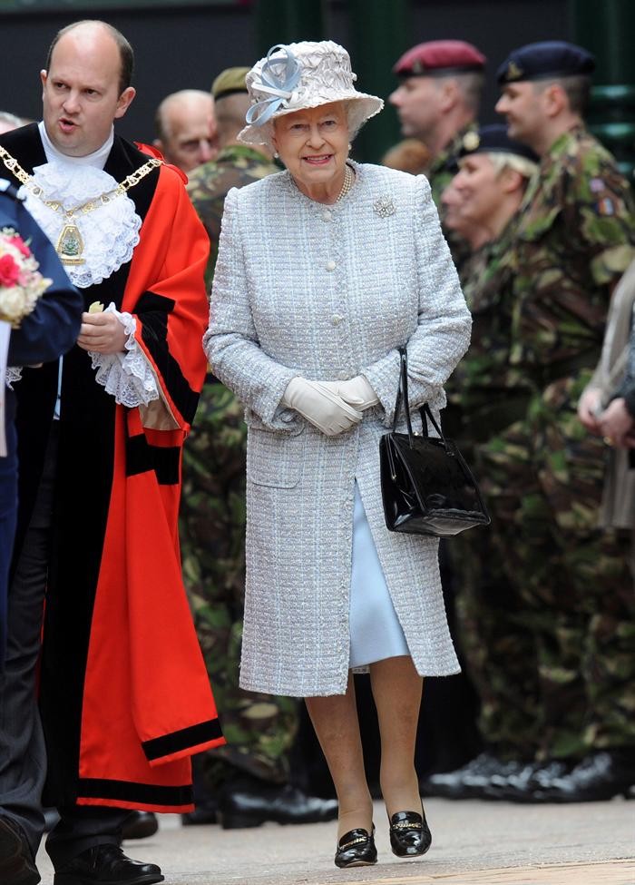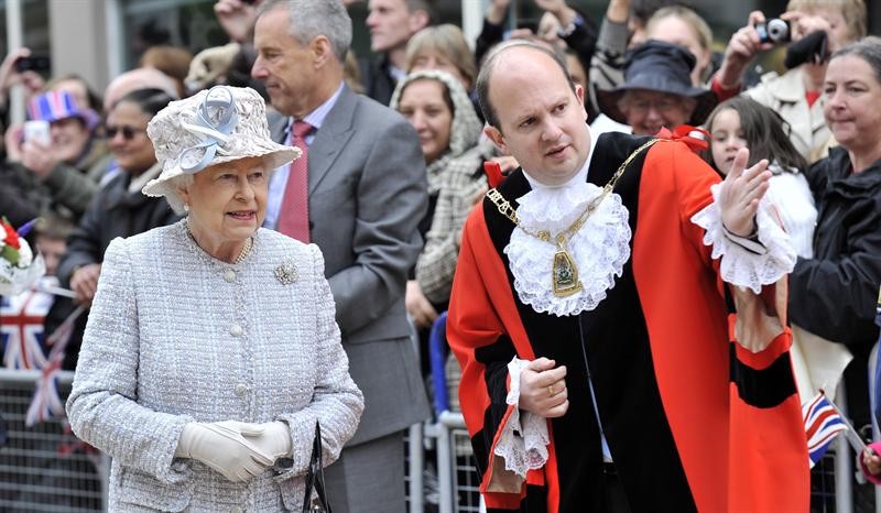 El alcalde de Bromley, David McBride (d), da la bienvenida a la reina Isabel II de Inglaterra.