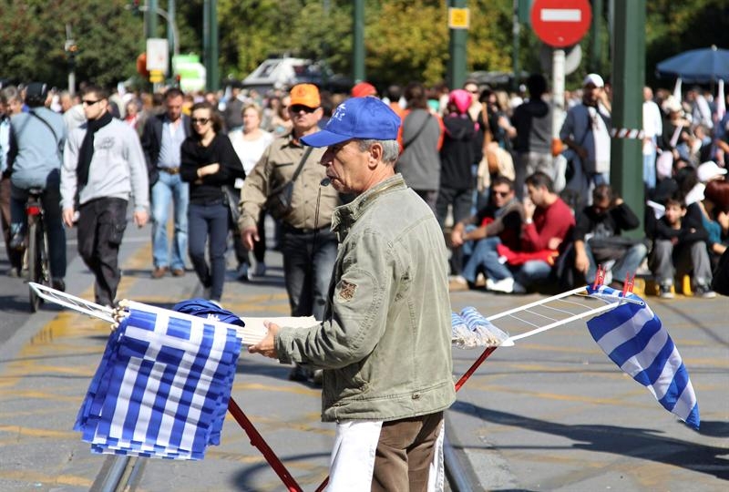 No hay nada de lo que el capitalismo no sea capaz de sacar partido. Con tan sólo un tendedero y decenas de banderas griegas, este hombre se gana un sobresueldo en el centro de Atenas. Las oportunidades de negocio puedan surgir en cualquier sitio y los emprendedores como éste saben aprovecharlas.