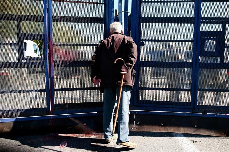 Este hombre observa a través de una puerta a la policía antidisturbios que vigila el Parlamento, en la plaza Sintagma (Constitución) de Atenas durante las protestas.