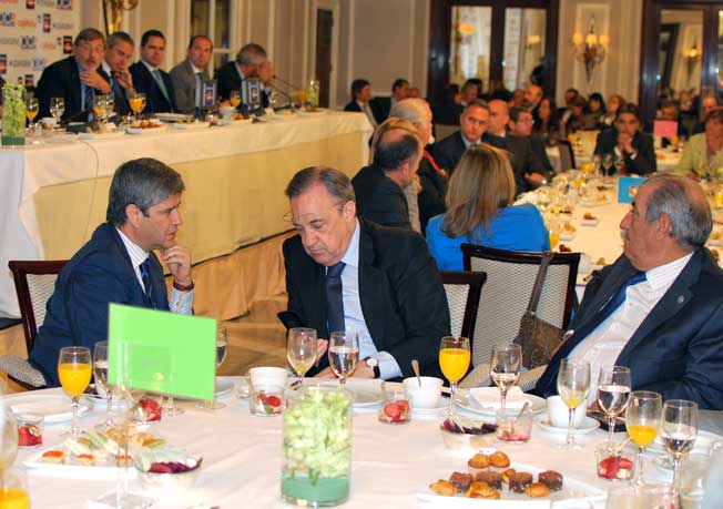 El presidente del Real Madrid, Florentino Pérez (centro), junto a uno sus antecesores en el cargo, Fernando Martín, y el ex presidente del Salamanca, Juan José Hidalgo (derecha).