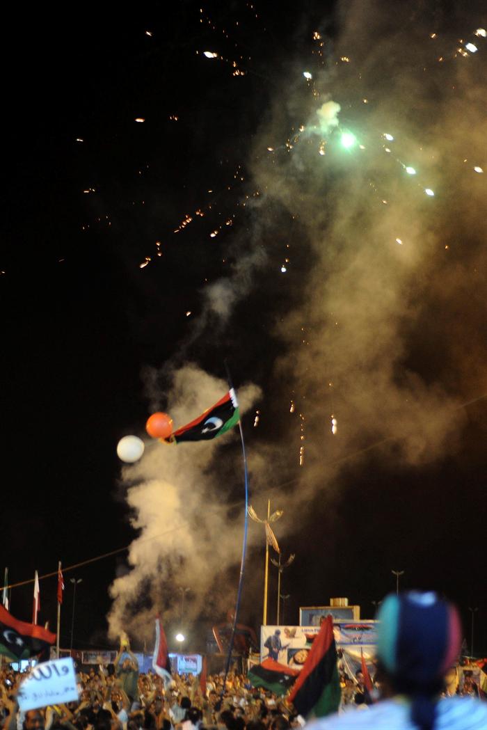 Fuegos artificiales iluminan el cielo mientras una multitud de personas celebra la toma de Trípoli y la detención de los hijos de Muamar Gadafi en Bengasi (Libia) durante la madrugada del lunes