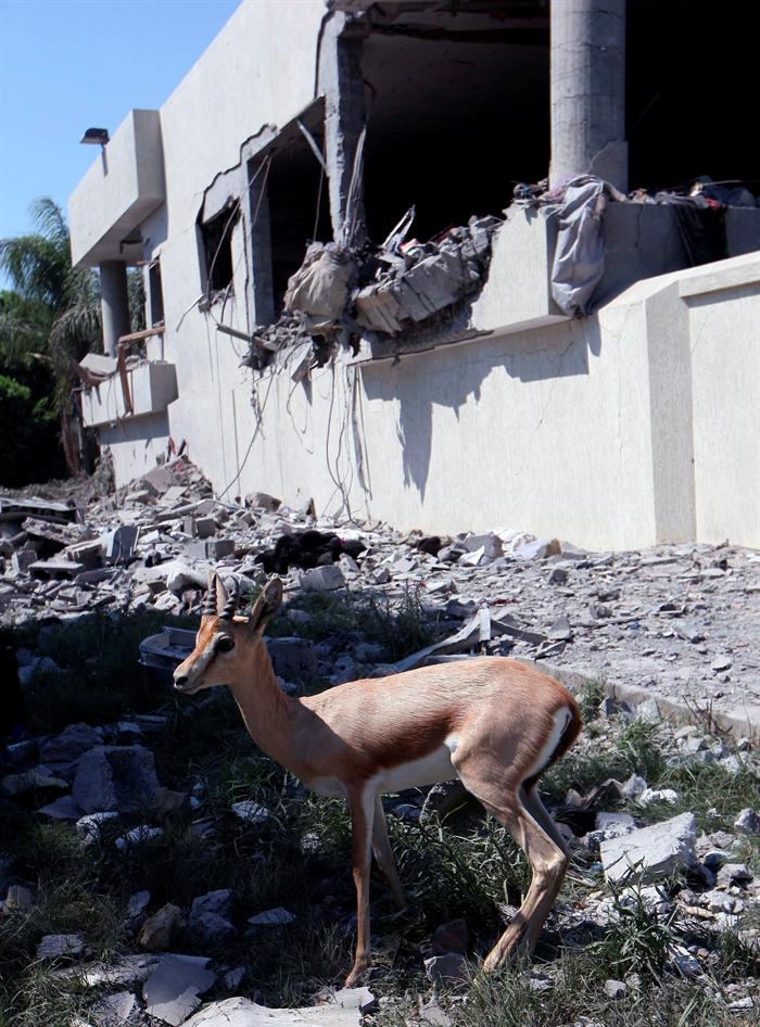 Una gacela junto a un edificio bombardeado por las tropas de la OTAN en Trípoli