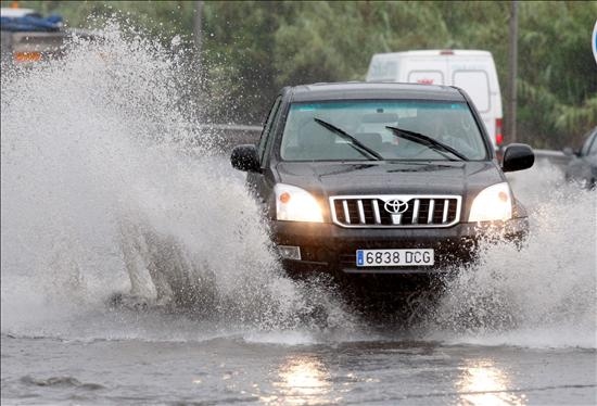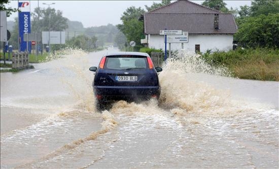 Un vehículo atraviesa una balsa de agua en la BI-735 en el municipio vizcaíno de Erandio momentos antes de ser cortada la vía como consecuencia de las lluvias caídas en este territorio