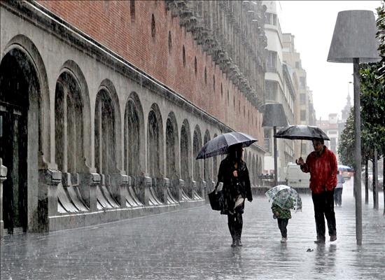 Una familia camina bajo la lluvia por una calle de Bilbao, donde las fuertes precipitaciones de las últimas horas están originando diversos problemas
