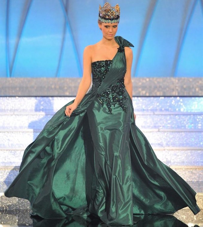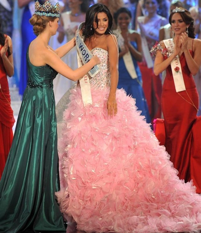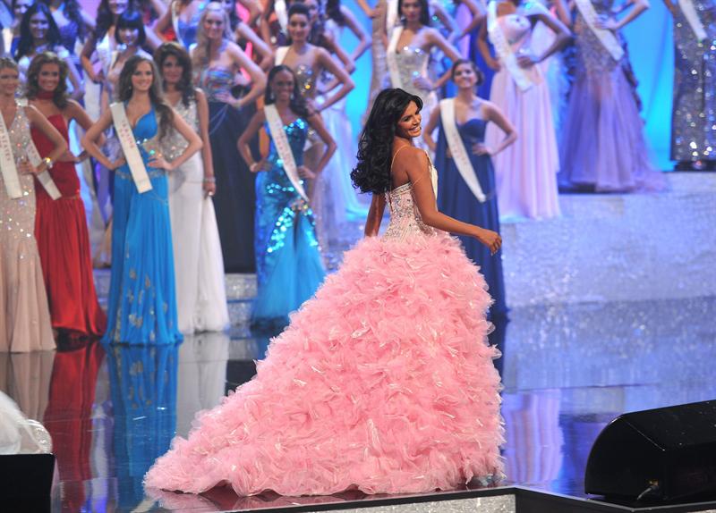 La representante de Venezuela, Ivian Lunasol Sarcos Colmenares, recibe la banda que la acredita como ganadora del concurso