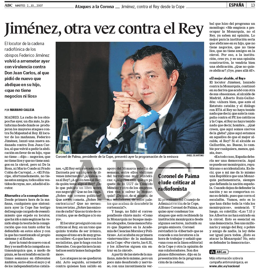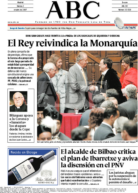 Portada del ABC del 2 de octubre de 2007. El periódico, dirigido por Zarzalejos, apuesta a fondo por la monarquía.