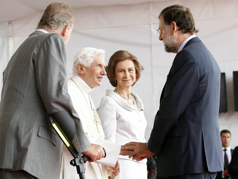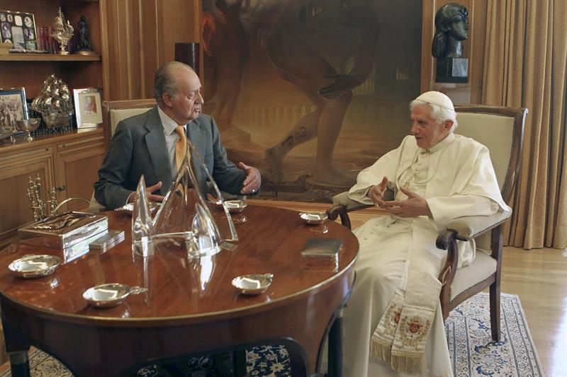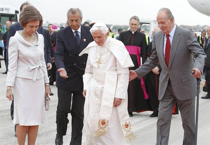 Los Reyes don Juan Carlos y Doña Sofía recibieron así al Pontífice el día de su llegada a Madrid.