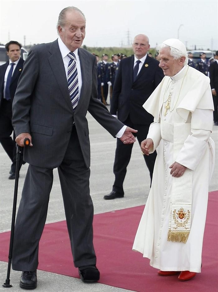 El rey Juan Carlos acompaña al papa Benedicto XVI durante la ceremonia de despedida en el aeropuerto de Barajas.