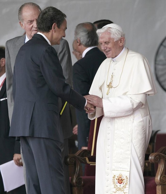El presidente de OHL, Juan Miguel Villar Mir, los ministros de la Presidencia y Fomento, Ramón Jaúregui y José Blanco, (de izda a dcha), la presidenta de la Comunidad de Madrid, Esperanza Aguirre (c), y su esposo Fernando Ramírez de Haro (4º izda), entre otros, durante la misa de clausura de la XXVI Jornada Mundial de la Juventud. Efe/Juan Carlos Hidalgo