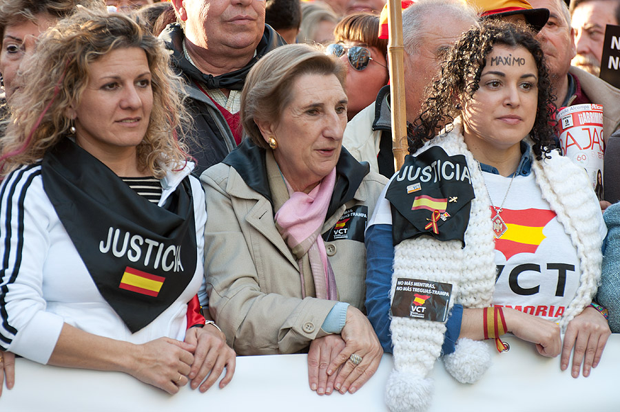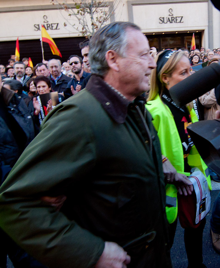 Los ex presidentes del PP vasco, Carlos Iturgáiz, Jaime Mayor Oreja y María San Gil llegaron juntos a la manifestación para acompañar a las víctimas del terrorismo. En la imagen, saludan al ex alcalde de Madrid José María Álvarez del Manzano