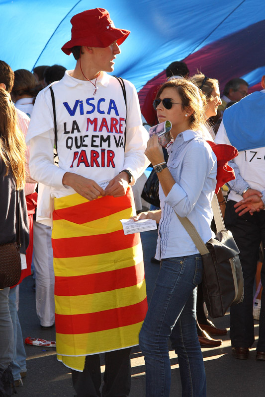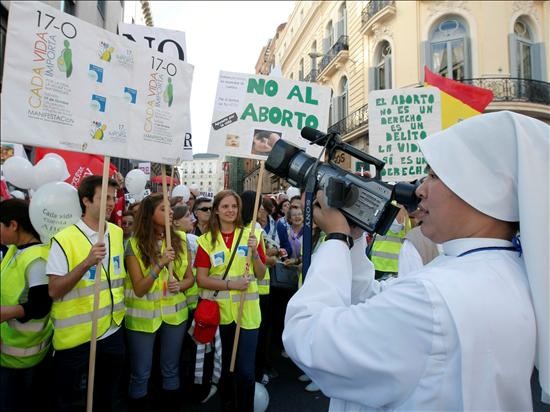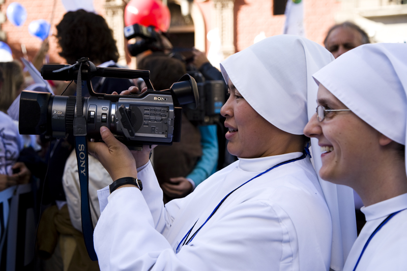 Dos religiosas graban en vídeo la manifestación para un canal católico.